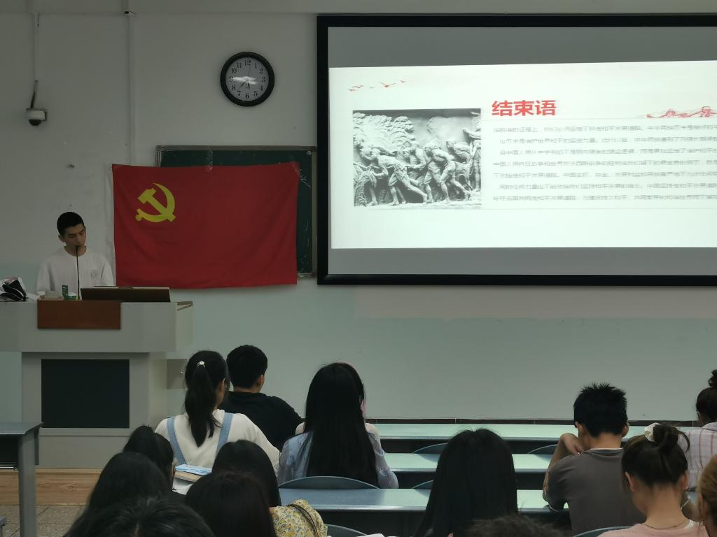 会上,徐浩轩同志从抗战精神、十四年抗战历史、抗战胜利原因以及重要意义四个方面进行了详细讲解。徐浩轩提到,中国共产党的中流砥柱作用是中国人民抗日战争胜利的关键,全民族抗战是中国人民抗日战争胜利的重要法宝。在中国人民抗日战争的壮阔进程中,形成了伟大的抗战精神,中国共产党带领中国人民向世界展示了天下兴亡、匹夫有责的爱国情怀,视死如归、宁死不屈的民族气节,不畏强暴、血战到底的英雄气概,百折不挠、坚忍不拔的必胜信念。在前进的征程上,中国坚持走和平发展道路,同时呼吁各国共同走和平发展道路,为建设持久和平、共同繁荣的和谐世界而不懈努力。