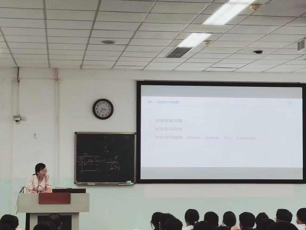 “我们专业学的到底是什么,该怎么学,学了能干什么?”计算机科学系主任陈晓燕教授以三个问题为导向,从专业认知、教师介绍、培养方案、学习建议四个方面展开,并强调了动手培养技术的重要性,“学以致用,我们想要将学到的知识转化为自己的能力,需要一个理论到实践的过程。”她还提出要强化学生实践技能培养,以“科学研究+专业竞赛”的培养模式提升学生就业竞争力。同时,陈晓燕介绍了专业未来发展方向及培养方案,建议新生早作规划,选好方向。分享“三转”的学习建议:转变思维习惯、转变学习方式、转变学习途径。鼓励同学们打开思维、变被动为主动、进行课外延伸学习。