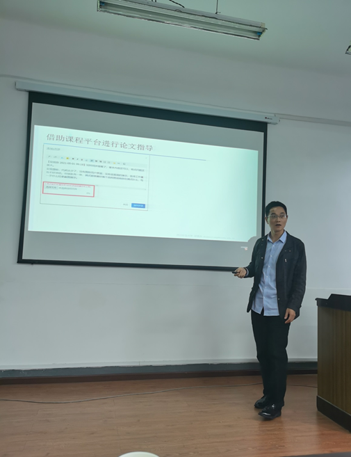 在经验交流环节,导师代表段旭良、蒲海波、李军进行了交流发言。他们均从学生选题、开题指导、论文指导等几个方面进行了经验分享。段旭良提出导师要重视学生的交流和引导,要根据学生的写作水平和论文质量进行分层、分重点的帮扶指导,同时向导师们讲解了借助课程平台提交论文和布置任务的方法和流程。蒲海波将毕业论文指导分为“选题动员”、“选题初定”、“开题报告撰写及毕业设计实施”和“毕业论文撰写”四个阶段,分享了各个阶段重点工作的具体方法,提出使用QQ共享屏幕进行一对一的修改和指导效果更佳。李军提出毕业论文(设计)工作在学生就业、择业和研究生面试等过程中具有重要作用,要因材施教,在充分了解每一个学生的思想状况、能力状况、个人意愿和就业去向基础上确定选题;要重视过程管理,通过“管控”来提升质量;导师要擅于归纳常见和共性和错误,及时解答学生疑问并协助解决。接下来的自由发言环节,本科生导师们各抒己见,分享了自己的经验和实际指导中遇到的困难和问题,讨论气氛热烈。