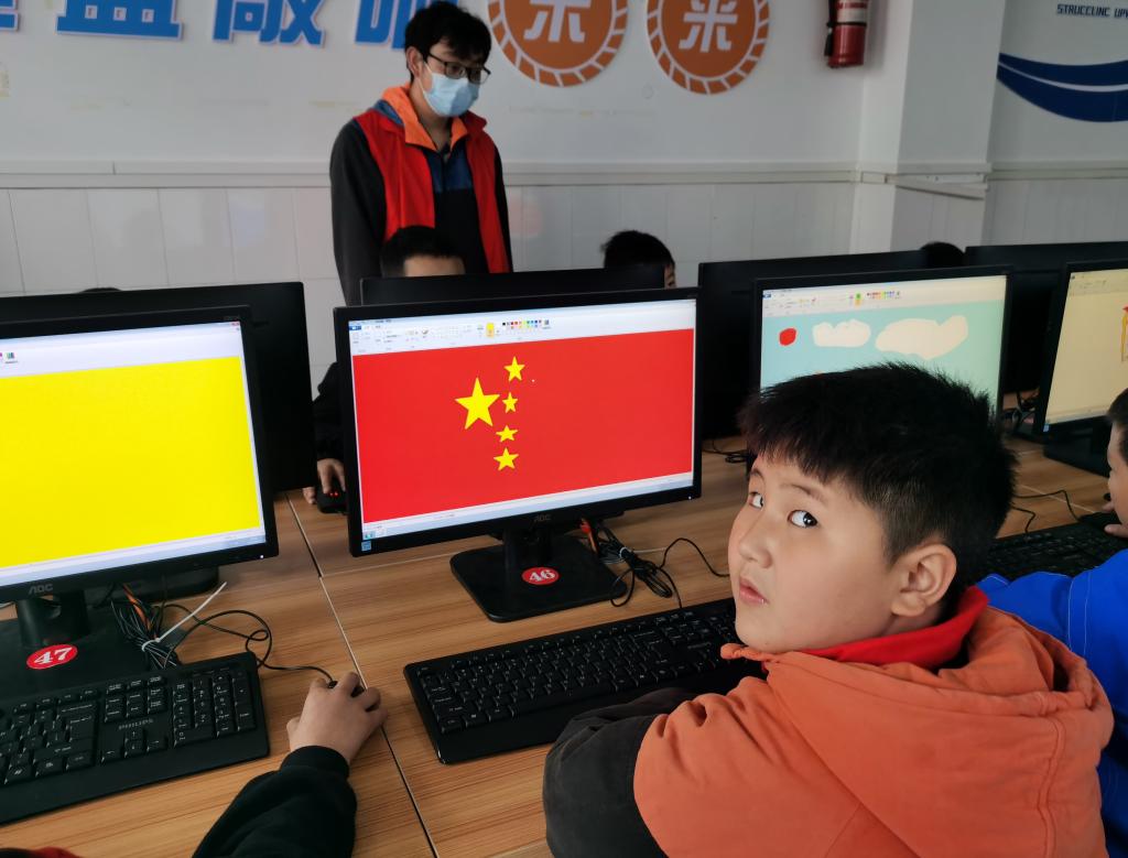 开讲前,志愿者们完成了分工,明确了各自的职责:一名志愿者负责统筹,一名志愿者负责讲解,其余志愿者则负责维持课堂秩序和辅助孩童们画图。在主讲人韦雪东的解说和志愿者的指导下,小朋友们逐渐由生疏到熟练地在电脑上画起图画来。其中有的小朋友画了一幅简单的家园画:几棵树,一个小房子,两三个人物和草地,虽寥寥几笔,确让人体会到了画中人物的欢乐。有的小朋友则画了一幅星空图:黑夜中闪烁着几颗明星,虽然画面布局十分简单,却也让人产生了对星空的向往。除此之外,许多小朋友都画了五星红旗,借此来表达他们的爱国之情,正所谓:“少年智则国智,少年强则国强。”