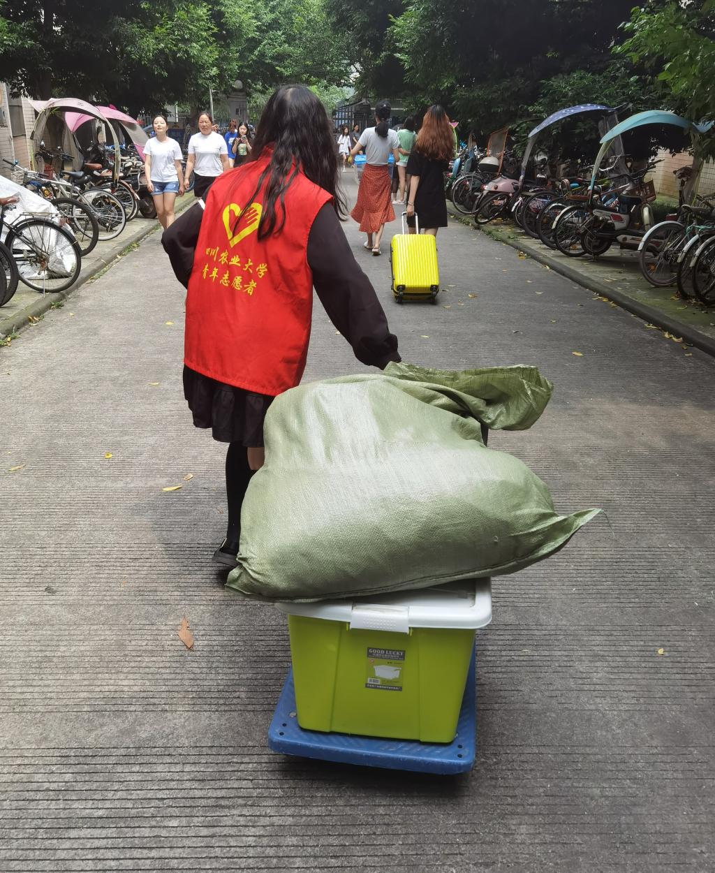 此次活动倡导同学们在毕业之际,把自己不需要的物品和书籍捐献出来,将资源传递给更多有需要的人,实现资源循环利用。同时,志愿者帮助毕业生们搬运行李,并向他们传递绿色离校、环保离校和感恩离校理念。活动过程中,有的毕业生直接前往设点处向志愿者寻求帮助,有的则在活动群里预约志愿者上寝,志愿者直接前往寝室提供行李爱心搬运服务。通过这一活动,志愿者们及时地向毕业生们伸出援手,减轻他们的负担,切实解决他们的烦恼,给即将离校的毕业生送上又一抹清凉。